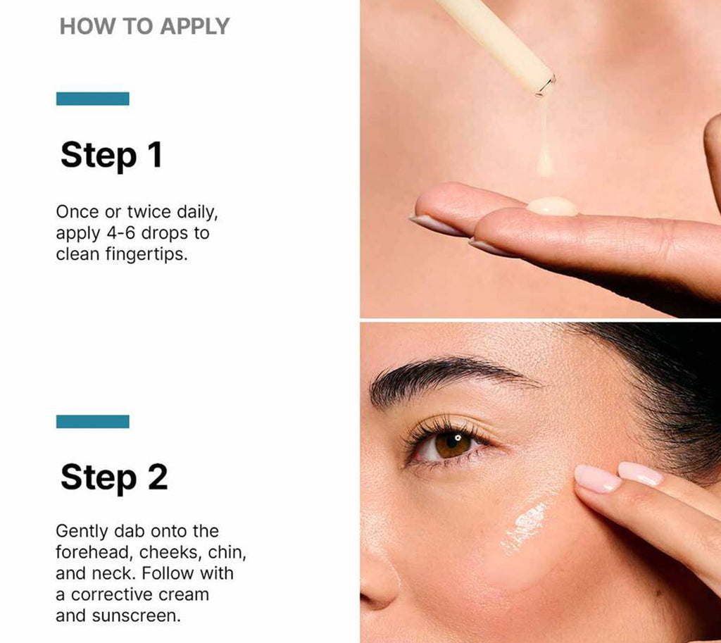 - Dispense one dropperful into your palm and dab onto forehead, cheeks, chin, and neck.
